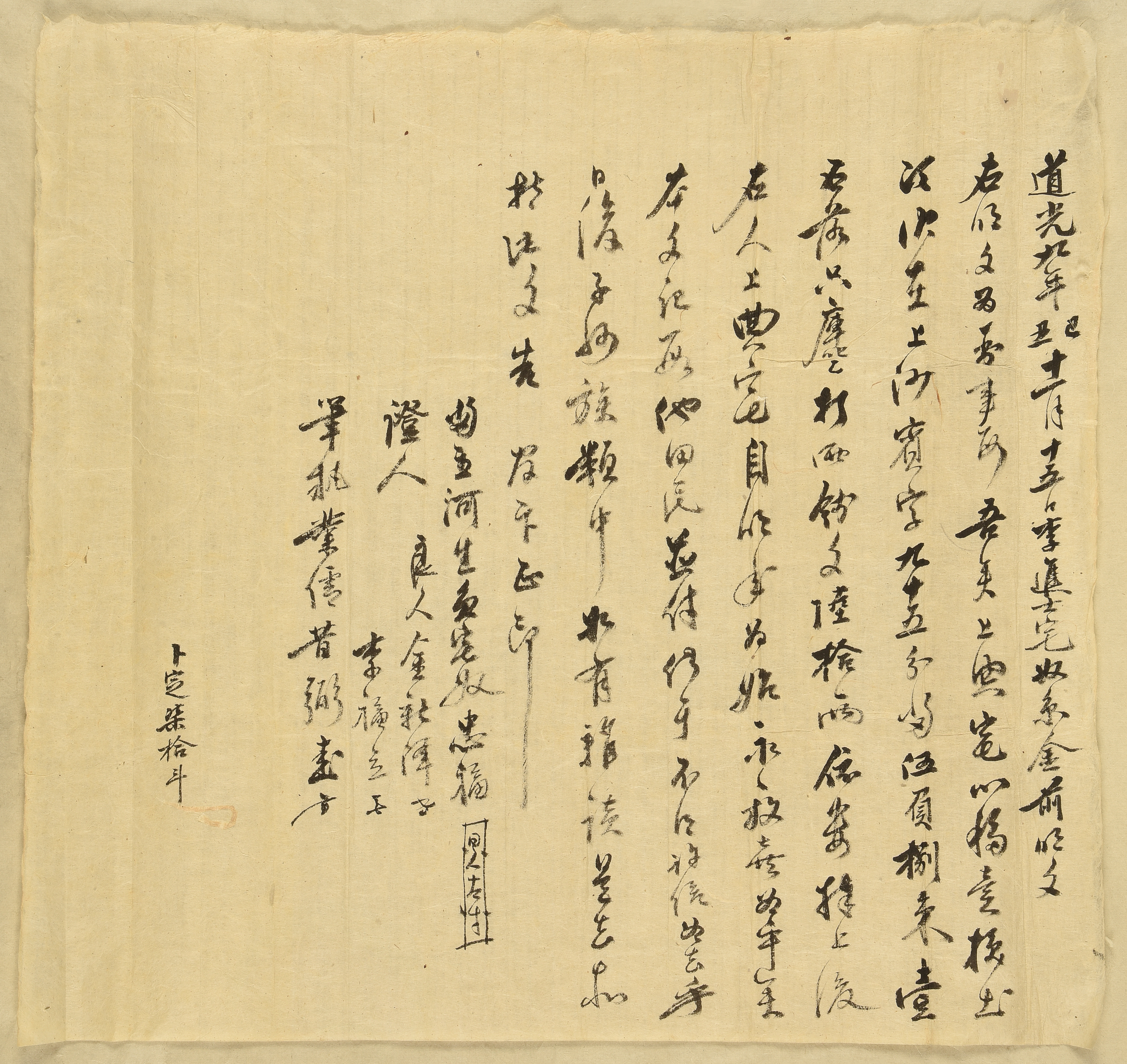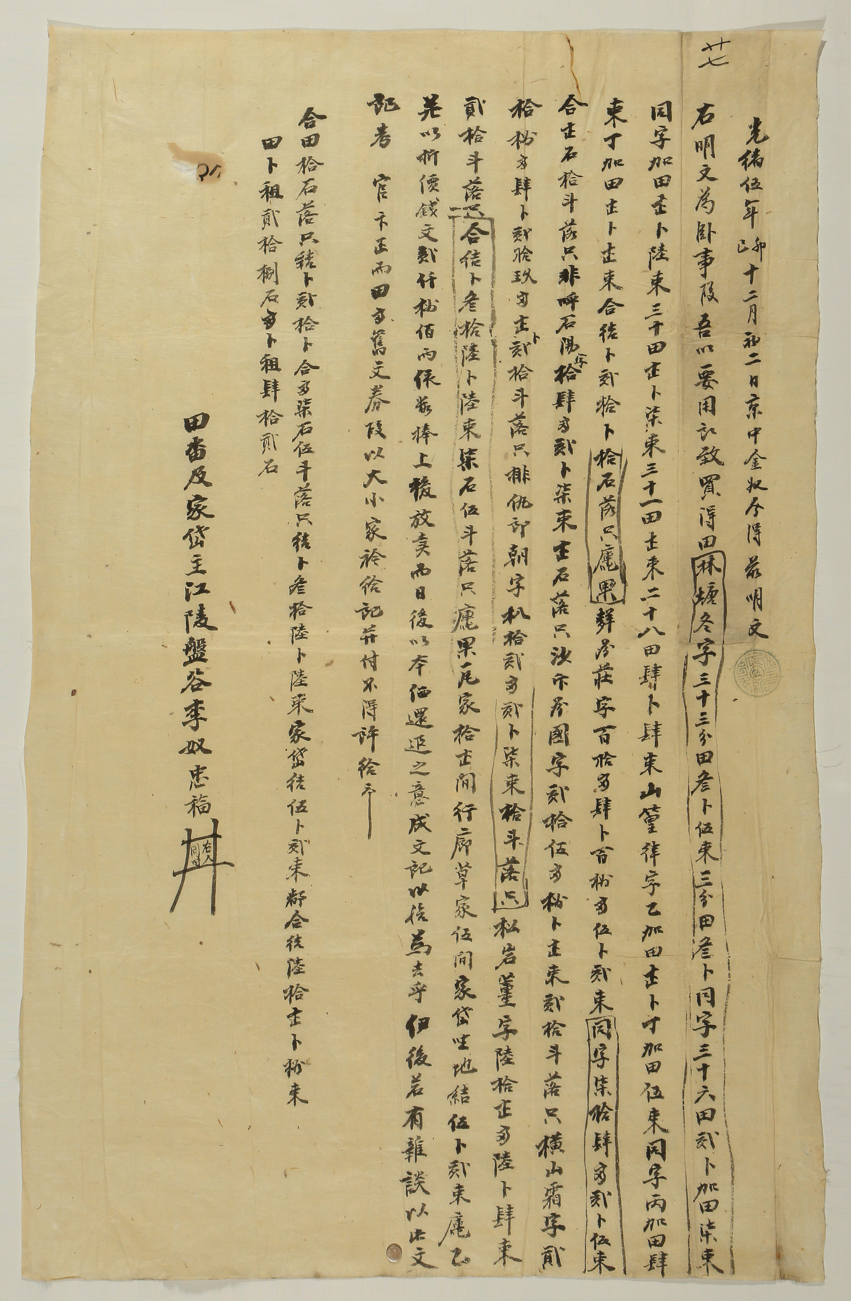 이 문서에는 전답과 집터의 주인이 강릉 반곡에 거주하는 이노 충복으로 되어 있다. "田畓及家垈主江陵盤谷李奴忠福" 상전댁이라는 말도 빠져 있다. "吾以要用所致" 그러나 충복은 매매의 대리인일 뿐이다. 문기 뒷부분에 있는 "以大小家衿給記幷付"라는 글 때문에 이렇게 추정할 수 있다. 깃급기는 깃급문기, 즉 재산을 분배한 내용을 기록한 분재기다. 대소가에서 유산으로 받은 내용이 아울러 붙어 있기 때문에 구문기를 줄 수 없다는 뜻이다. 이용구 이봉구 형제 이후로 선교장에서는 집을 대택과 소택으로 나눠서 경영했다. 즉, 토지와 주택 그리고 재산을 모두 나눠서 관리했다. 물론 하나의 가족이라는 울타리 아래서 공동으로 관리했다. 따라서 이곳의 대소가는 선교장을 가리키는 것으로 보인다. 충복 자신의 집안은 아닐 것이다. 계약이 이뤄진 시점인 1879년 즈음에 작성된 호구단자가 있다면 충복이 선교장의 노비였는지를 확인할 수 있을 것이지만, 유감스럽게도 선교장의 호구단자는 1843년의 것이 마지막이다. 달리 근거를 찾을 방법이 없을까?