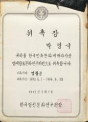 1993년 한국정신문화연구원에서 박영국을 한국민족문화대백과사전 명예향토문화연구위원에 위촉한 위촉장. 위촉기간: 1993년 5월 1일 ~ 1994년 4월 30일.